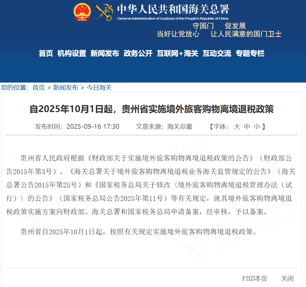 海關總署網站9月16日發佈消息,貴州省人民政府根據《財政部關於實施境外旅客購物離境退税政策的公告》(財政部公告2015年第3號)、《海關總署關於境外旅客購物離境退税業務海關監管規定的公告》(海關總署公告2015年第25號)和《國家税務總局關於修改〈境外旅客購物離境退税管理辦法(試行)〉的公告》(國家税務總局公告2025年第11號)等有關規定,就其境外旅客購物離境退税政策實施方案向財政部、海關總署和國家税務總局申請備案,經審核,予以備案。