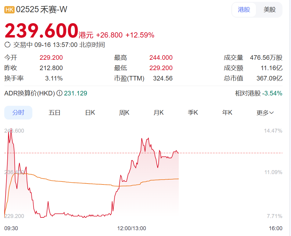 觀察者網注意到,港股開盤後禾賽科技隨即迎來大漲,盤中一度衝高至244港元,漲幅超14%,市值超360億港元。截至發稿前,禾賽科技漲12.59%,報239.60港元。