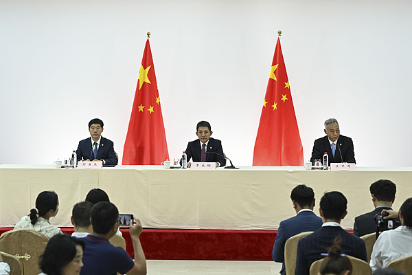 當地時間2025年9月15日,西班牙馬德里,中國商務部國際貿易談判代表兼副部長李成鋼、商務部新聞發言人何亞東、中國國家互聯網信息辦公室副主任王京濤出席記者會。中美雙方就以合作方式妥善解決TikTok問題、減少投資障礙、促進有關經貿合作等達成了基本框架共識。 視覺中國