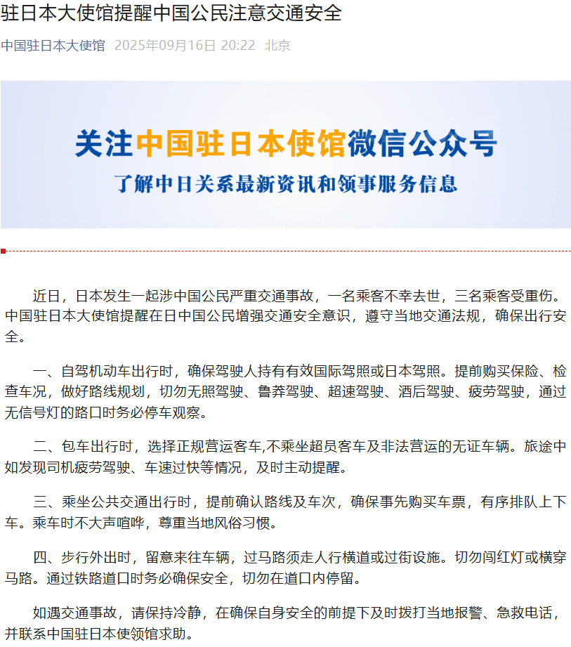 近日,日本發生一起涉中國公民嚴重交通事故,一名乘客不幸去世,三名乘客受重傷。中國駐日本大使館提醒在日中國公民增強交通安全意識,遵守當地交通法規,確保出行安全。
