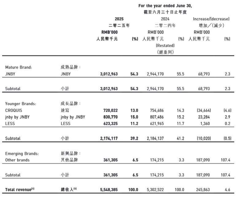 主品牌JNBY作為已有逾30年曆史的成熟品牌,依然是集團的收入支柱。2025財年,JNBY收入同比增長2.3%,達到30.13億元,佔總收入的54.3%。