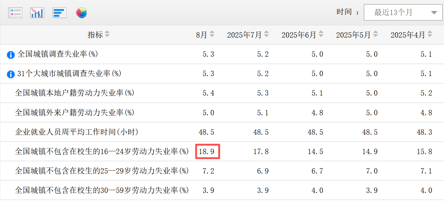 觀察者網17日查閲國家統計局網站發現,2025年8月,全國城鎮不包含在校生的16—24歲勞動力失業率錄得18.9%,為2023年12月公佈這一數據以來新高。