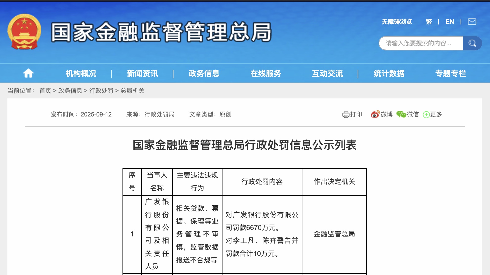 9月12日,國家金融監督管理總局發佈行政處罰信息,廣發銀行股份有限公司因相關貸款、票據、保理等業務管理不審慎,監管數據報送不合規等多項違法違規行為,被處以6670萬元罰款。