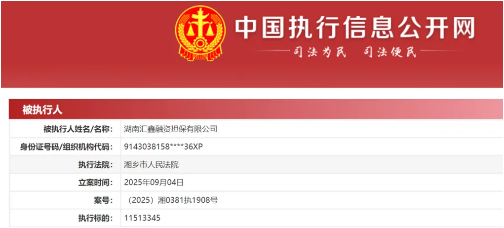 日前,據中國執行信息公開網、企查查官網披露,湖南匯鑫融資擔保有限公司(簡稱“匯鑫融擔”)成為被執行人,執行標的為11513345元,執行法院為湖南省湘潭市湘鄉市人民法院,立案時間為2025年9月4日。有媒體稱,這不僅折射出省唄業務體系潛在的風險挑戰,也在業內引發了關於助貸機構風險管控能力的廣泛討論。