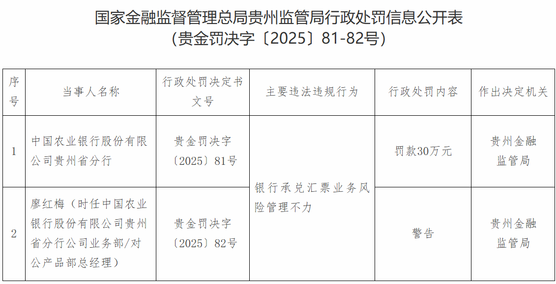 國家金融監督管理總局貴州監管局公佈的處罰信息顯示,因銀行承兑匯票業務風險管理不力,中國農業銀行股份有限公司貴州省分行被罰款30萬元,時任中國農業銀行股份有限公司貴州省分行公司業務部/對公產品部總經理廖紅梅被警告。
