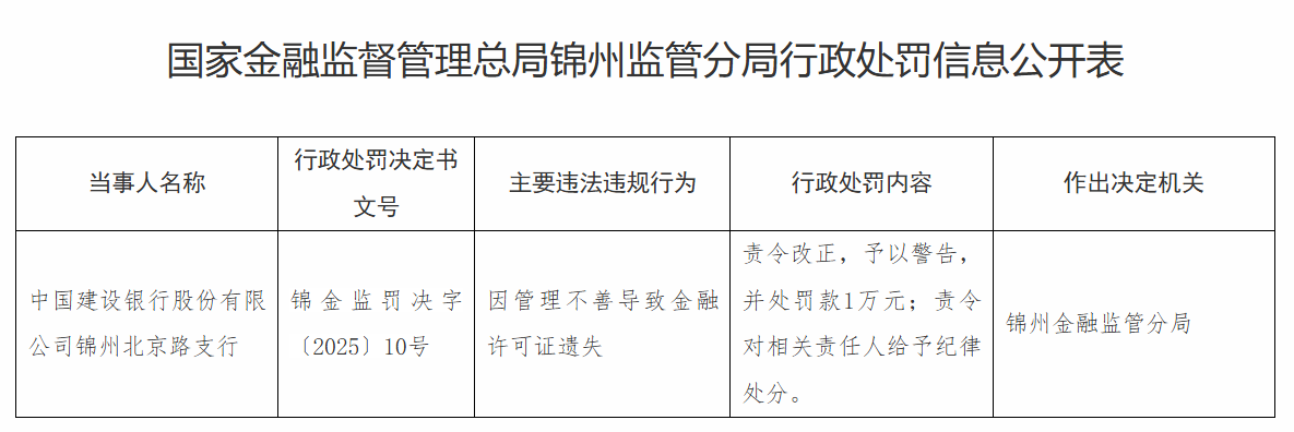 國家金融監督管理總局錦州監管分局行政處罰信息公開表顯示,因管理不善導致金融許可證遺失,對中國建設銀行股份有限公司錦州北京路支行責令改正,予以警告,並處罰款1萬元;責令對相關責任人給予紀律處分。