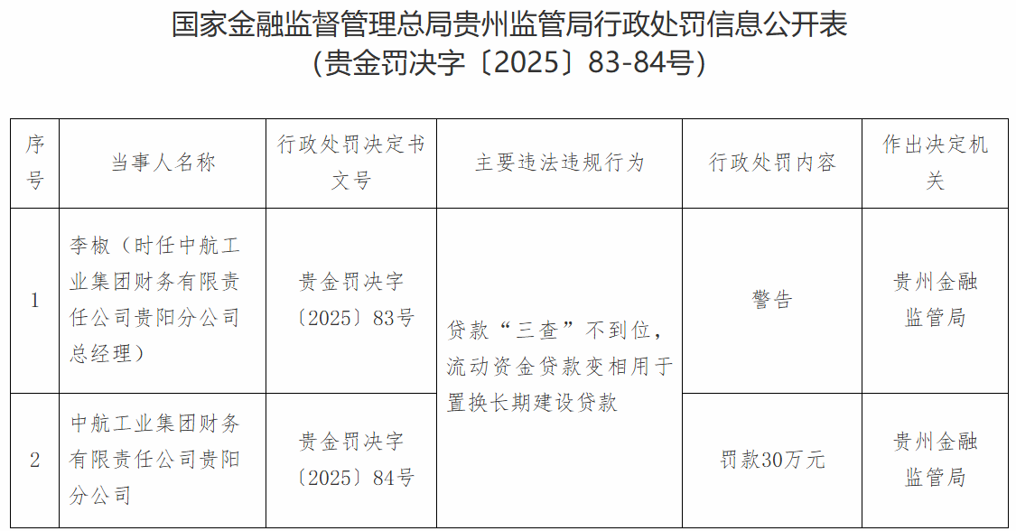 因存在貸款“三查”不到位,流動資金貸款變相用於置換長期建設貸款問題,中航工業集團財務有限責任公司貴陽分公司被罰款30萬元,時任中航工業集團財務有限責任公司貴陽分公司總經理李椒被警告。