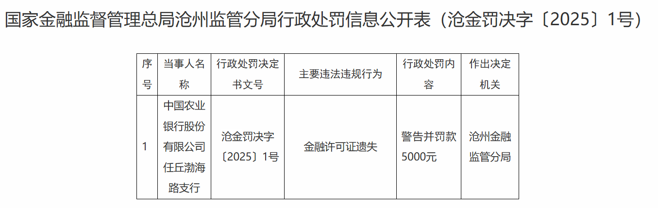 因類似問題被罰的還有農業銀行。國家金融監督管理總局滄州監管分局表示,因金融許可證遺失,中國農業銀行股份有限公司任丘渤海路支行被警告並罰款5000元。