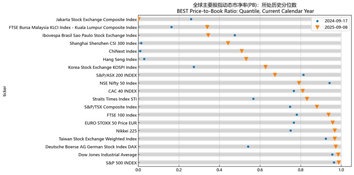 第一,估值整體合理,未現普遍高估。從全球主要股市的市淨率(PB)水平來看,A 股主要指數(創業板指、滬深 300)及恒生指數的PB均處於自身歷史中位數水平。橫向來看,A股估值與美國標普 500、道瓊斯工業指數等發達國家指數相比,也處於相對合理區間。