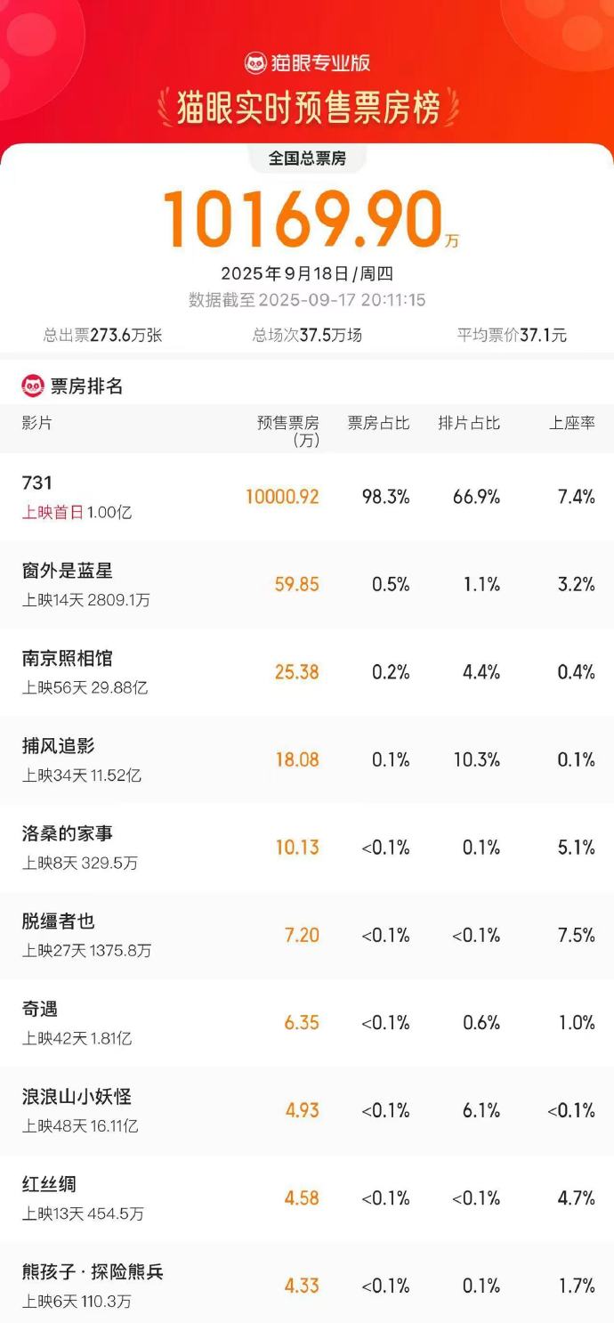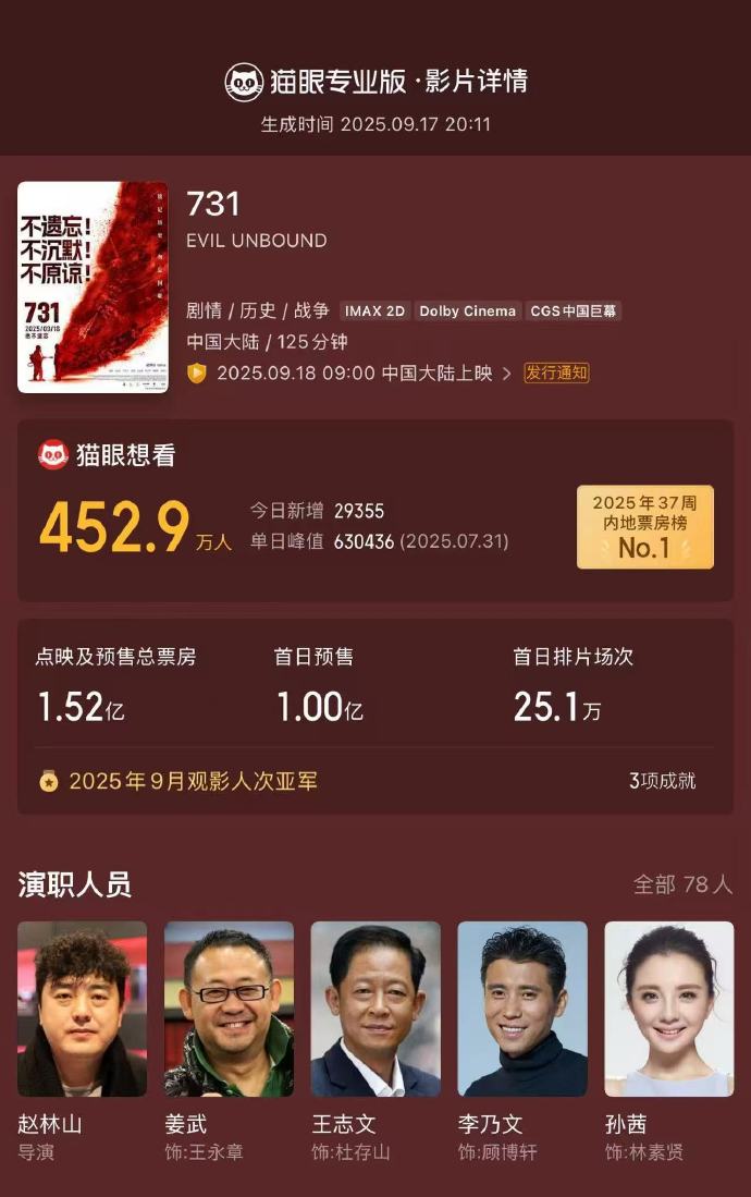 @貓眼專業版 9月17日消息,電影《731》首日預售票房破億。