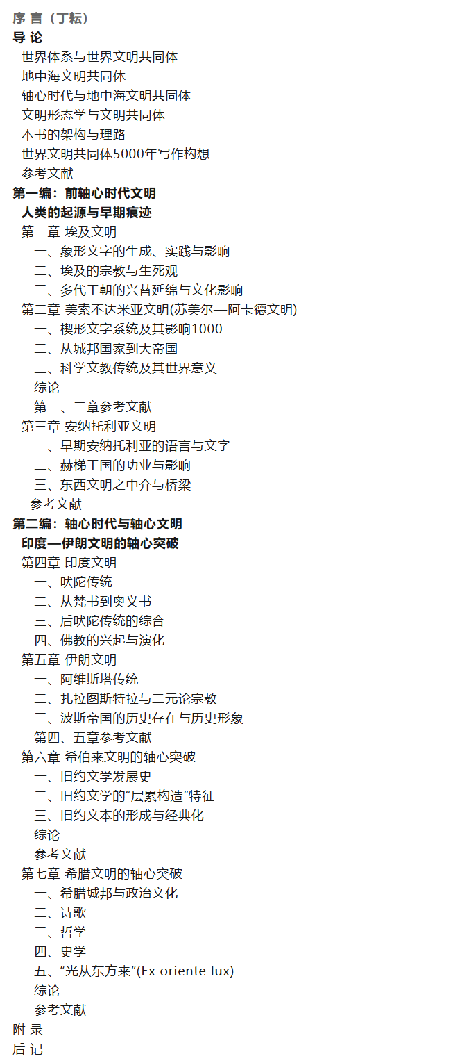 本書涉及的主要內容包括:作為前軸心時代成就代表的埃及文明與美索不達米亞文明(蘇美爾-阿卡德文明),作為東西方文明(特別是美索不達米亞文明與希臘文明)之中介的安納托利亞文明,以及實現了軸心突破的伊朗文明、希伯來文明與希臘文明。本書還專門開闢一章對印度文明加以討論。