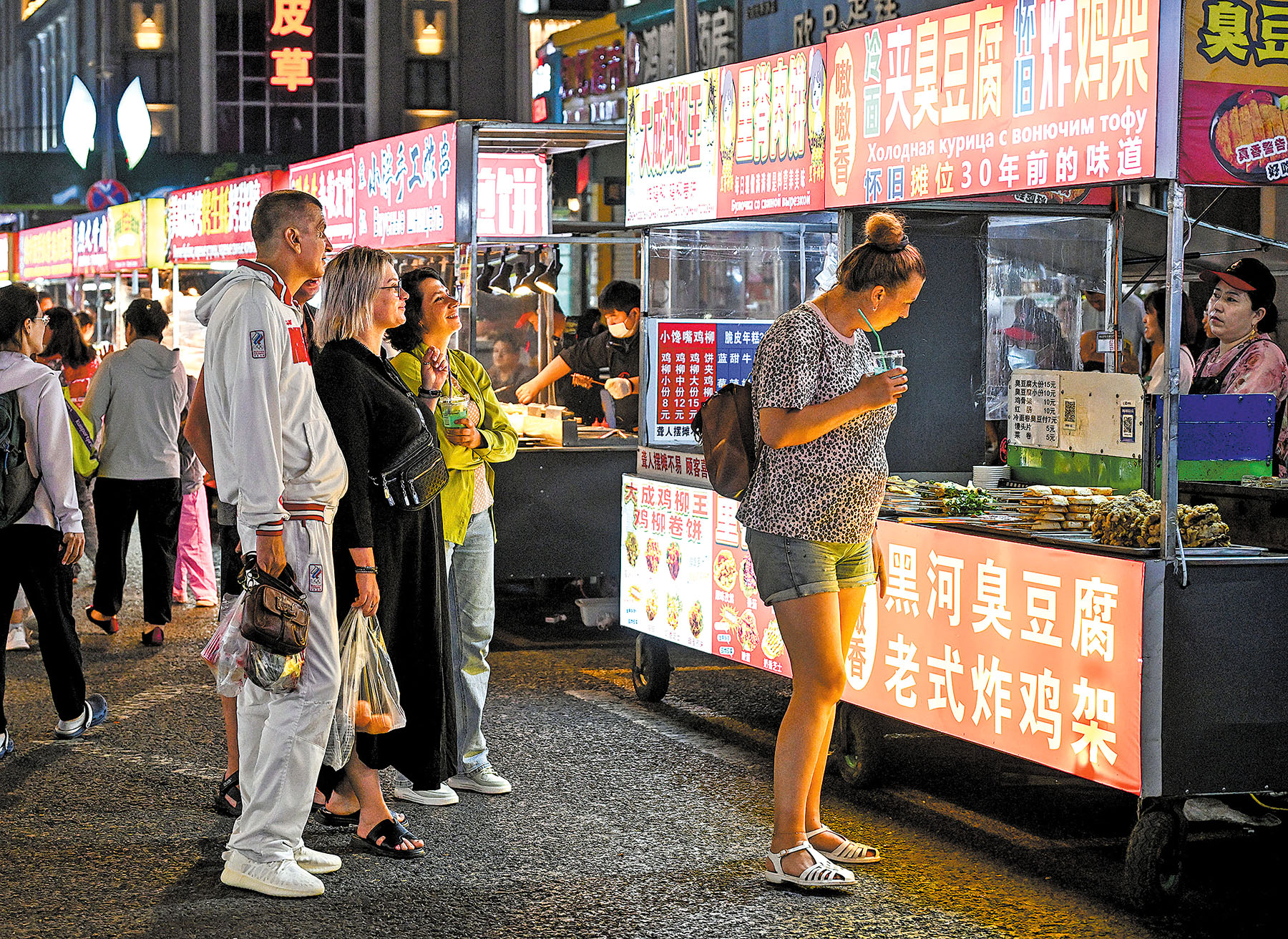 在黑龍江省黑河市,俄羅斯遊客漫步在夜市中,享受着各種小吃和美食 China Daily