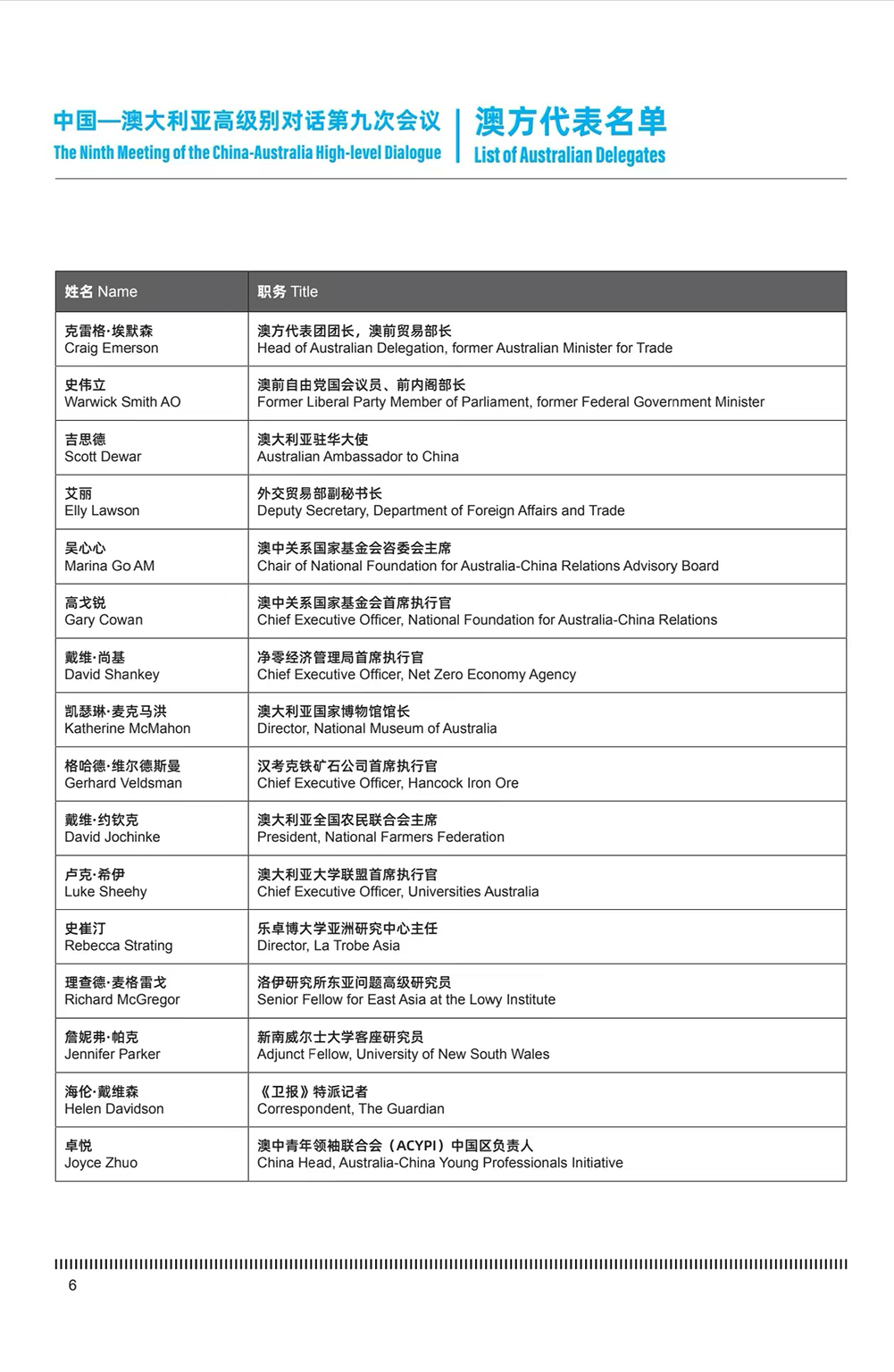 澳方代表團團長、前貿易部長埃默森表示,今年7月,澳大利亞總理阿爾巴尼斯連任後不久即對中國進行訪問,體現了澳方對澳中關係的高度重視。澳中雙方應加強對話,探討可以深化合作的領域,妥善管控存在的分歧。今年是澳中自貿協定生效實施10週年,兩國經濟高度互補,雙邊貿易額迅速增長。參加此次對話的澳方代表來自農業、資源、教育、衞生、智庫等各個領域,期待着同中方代表進行深入交流。