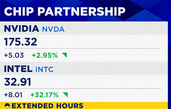 消息公佈後,英特爾股價在盤前交易中一度猛漲超30%,英偉達股價也上漲3%左右。