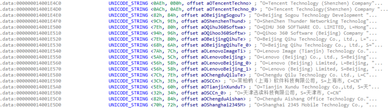 此外,UCPD還內置了針對中國軟件廠商的攔截機制,通過數字簽名黑名單、進程名黑名單、進程路徑黑名單進行過濾,限制第三方軟件與微軟體系軟件的競爭,維護其市場壟斷地位。