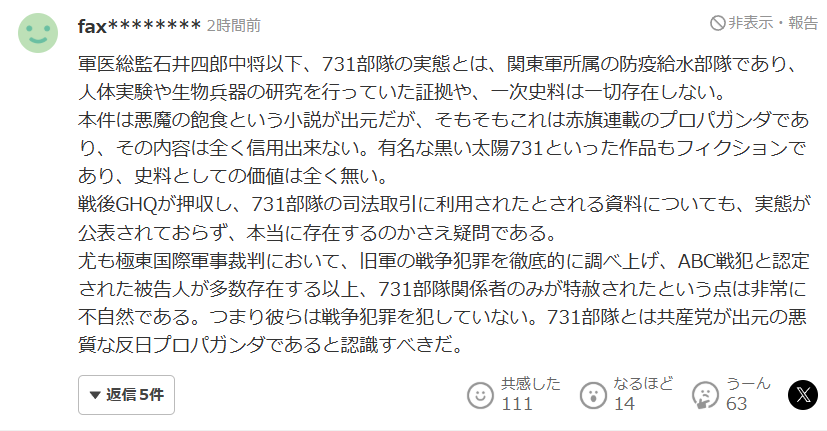同時,在相關新聞下僅有的幾條回覆當中,也不乏為“731”部隊洗地開脱,宣稱“能證明其進行人體實驗和生物兵器研究的證據、一手材料均不存在”的評論。