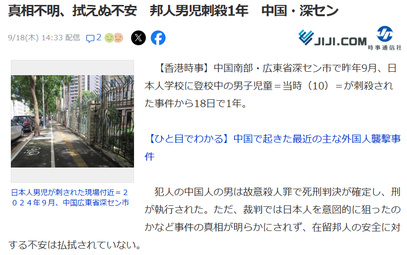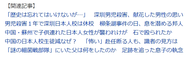 除此之外,觀察者網還注意到,無論是在部分日本媒體的報道中,還是在日本新聞平台的“關聯文章”推薦中,相關方都有意將“918”事變紀念日與2024年9月18日一名深圳日本人學校的學生遇襲去世的消息進行無端關聯。例如日本的重要媒體時事通信社就以此為主題,表示“在華日本人無法消除心中的不安”。