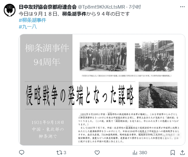 僅有一條來自“日中友好協會京都府聯合會”的賬號宣傳“柳條湖事件”(即“九·一八事變”在日本的別稱)是日本對華侵略戰爭的開端。但該動態幾乎沒有獲得任何互動。