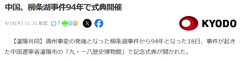 共同社報道中國舉辦“九·一八事變”紀念儀式的簡訊