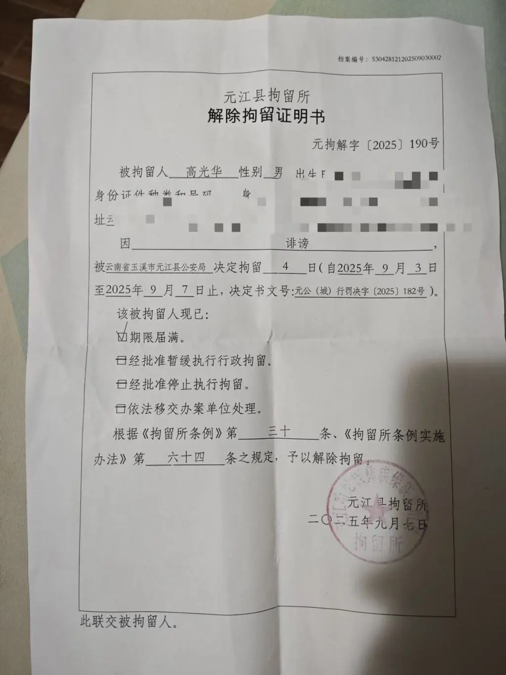 元江縣公安局認為高光華誹謗,對其違法行為處以行政拘留四日的處罰。