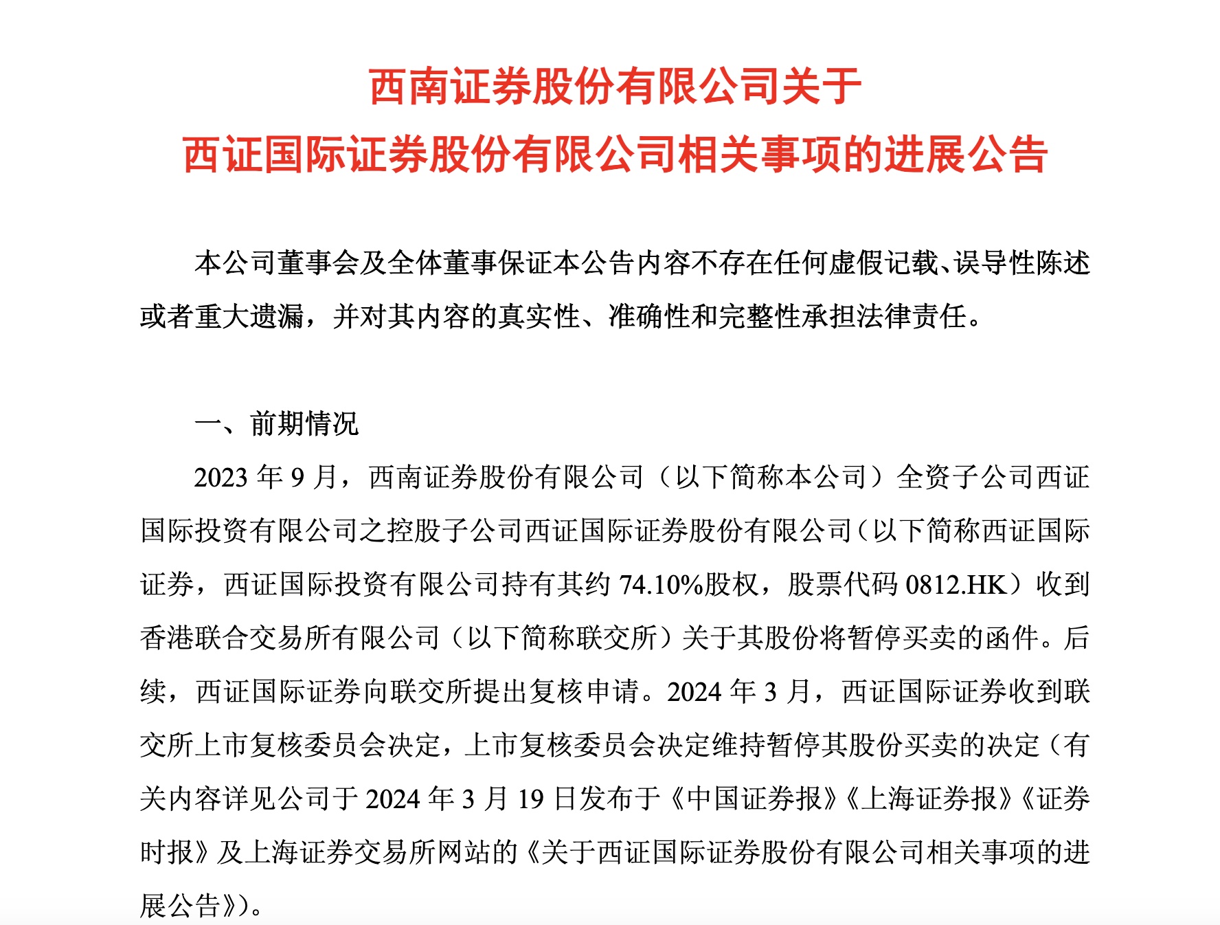 西南證券在公告中表示,西證國際證券經營規模較小,佔公司整體比重較低,該事項不會對公司日常經營活動構成重大影響。