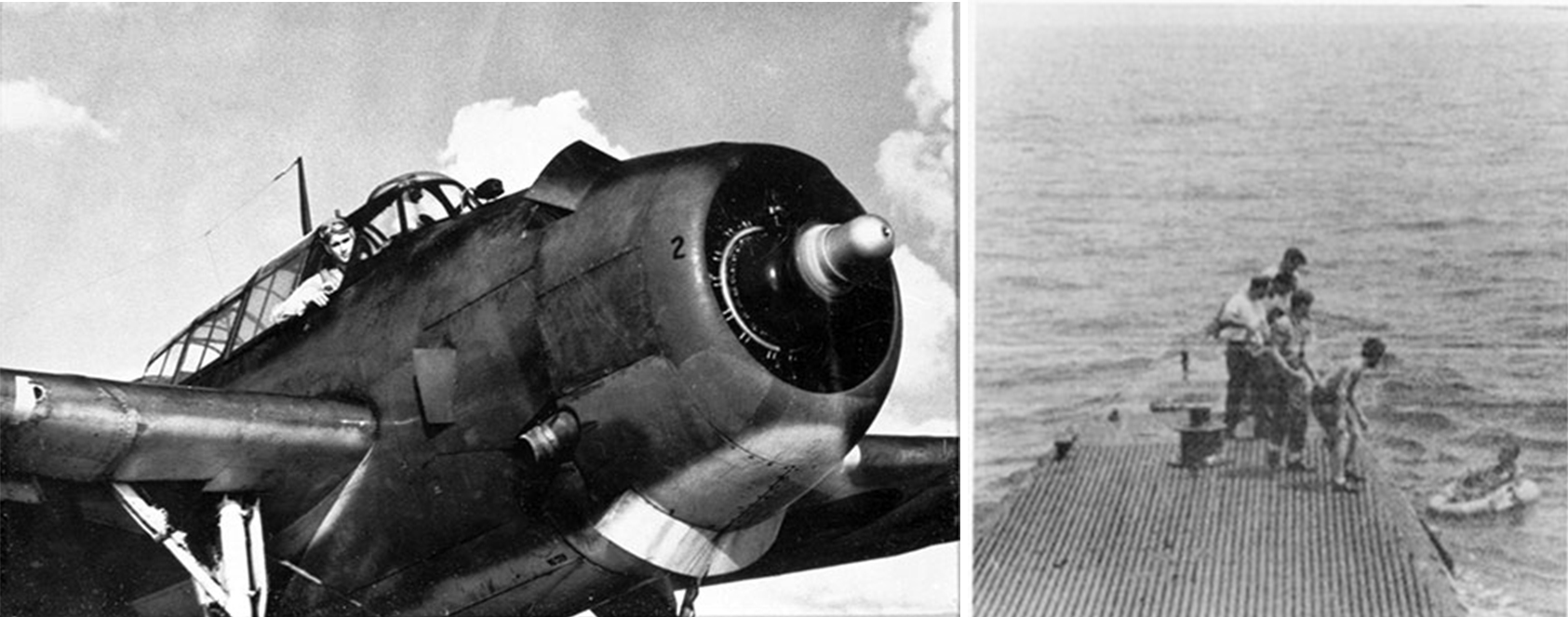 左上圖:老布什駕機起飛前的照片。右上圖:老布什跳傘落水後被美國海軍潛艇長鬚鯨號USS Finback救起。