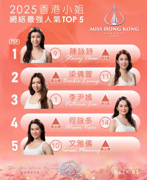 近年來,港姐競選呈現出更加明顯的高學歷化趨勢。2025年港姐決賽中,14強全員均為本科及以上學歷,其中碩士畢業生四位,在讀博士生一位。