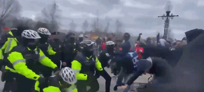 抗議者與維持秩序的警察發生暴力衝突,抗議者推翻了國會大廈西側的路障。 圖自《華盛頓郵報》