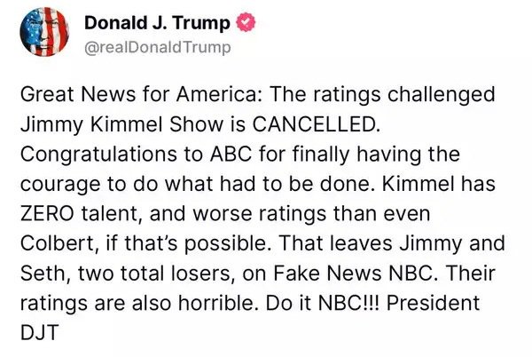 但是,“吉米雞毛秀”當年並沒有因為這種明顯的種族主義反人類言論而關門;導致這個節目被叫停的,是因為前幾天節目上説特朗普政府正假惺惺地利用這場刺殺案來謀取政治利益。老實説,“吉米雞毛秀”的這些言論已經非常尊重查理·柯克了,他們沒有像很多自由派那樣幸災樂禍説查理·柯克是咎由自取,而僅僅是擔心他在死後被人利用——但仍然,一旦被特朗普當作反面典型點了名,那從聯邦機構到廣播公司就都容不下他了。