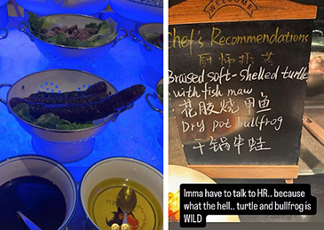 她拍了一張自助餐中的菜單,上面寫着“花膠燒甲魚”“乾鍋牛蛙”。她寫道:“我要和HR(人力資源)談一談,因為這些都是什麼東西。甲魚和牛蛙太離譜了。”