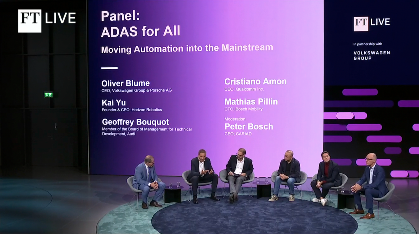 此次主題討論的嘉賓包括大眾汽車集團CEO奧博穆(Oliver Blume)、地平線創始人兼CEO餘凱、高通CEO安蒙(Cristiano Amon)、CARIAD CEO彼得·博世(Peter Bosch)、奧迪技術開發董事會成員傑弗裏·布庫(Geoffrey Bouquot)、博世移動CTO馬提亞斯·皮林(Mathias Pillin)等。