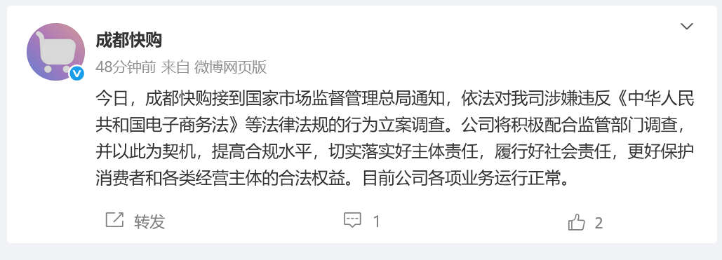 當天晚些時候,成都快購科技有限公司回應稱,“今日,成都快購接到國家市場監督管理總局通知,依法對我司涉嫌違反《中華人民共和國電子商務法》等法律法規的行為立案調查。公司將積極配合監管部門調查,並以此為契機,提高合規水平,切實落實好主體責任,履行好社會責任,更好保護消費者和各類經營主體的合法權益。目前公司各項業務運行正常。”