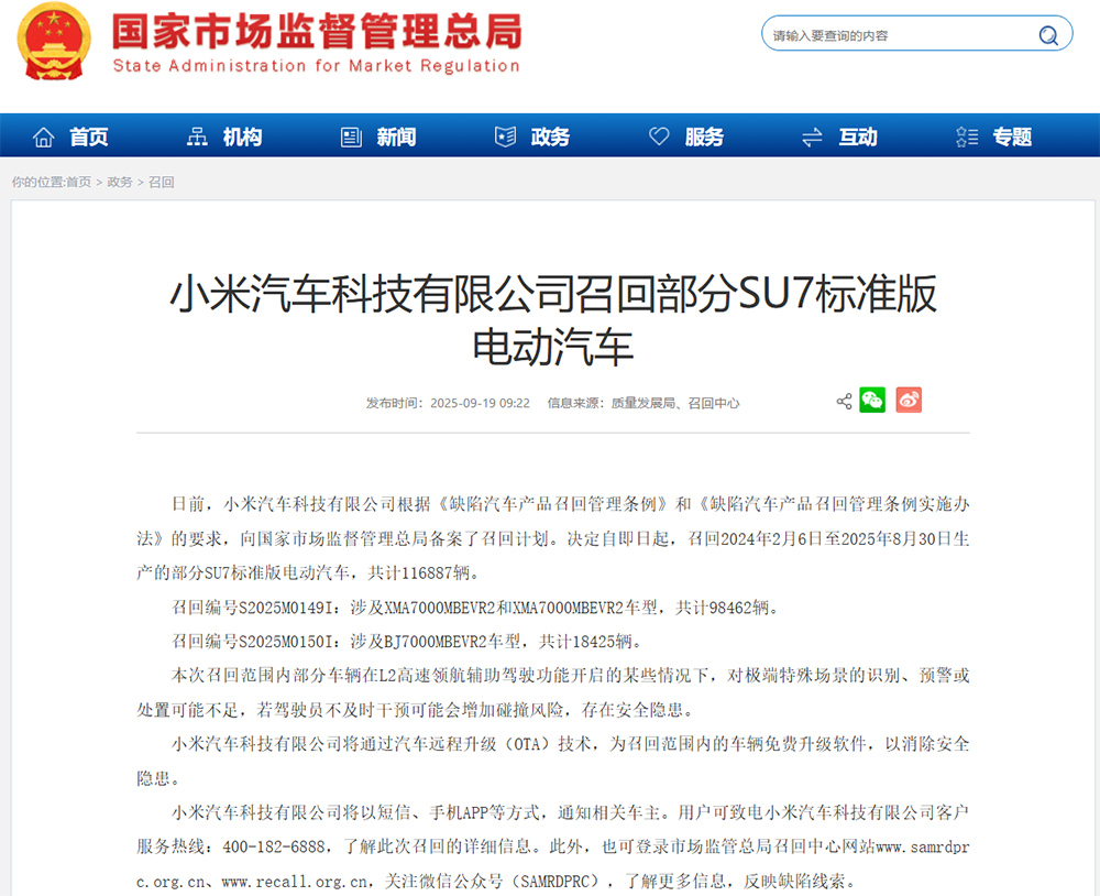 9月19日早間,國家市場監督管理總局網站發佈消息稱,小米汽車科技有限公司決定自即日起,召回2024年2月6日至2025年8月30日生產的部分SU7標準版電動汽車,共計116887輛。
