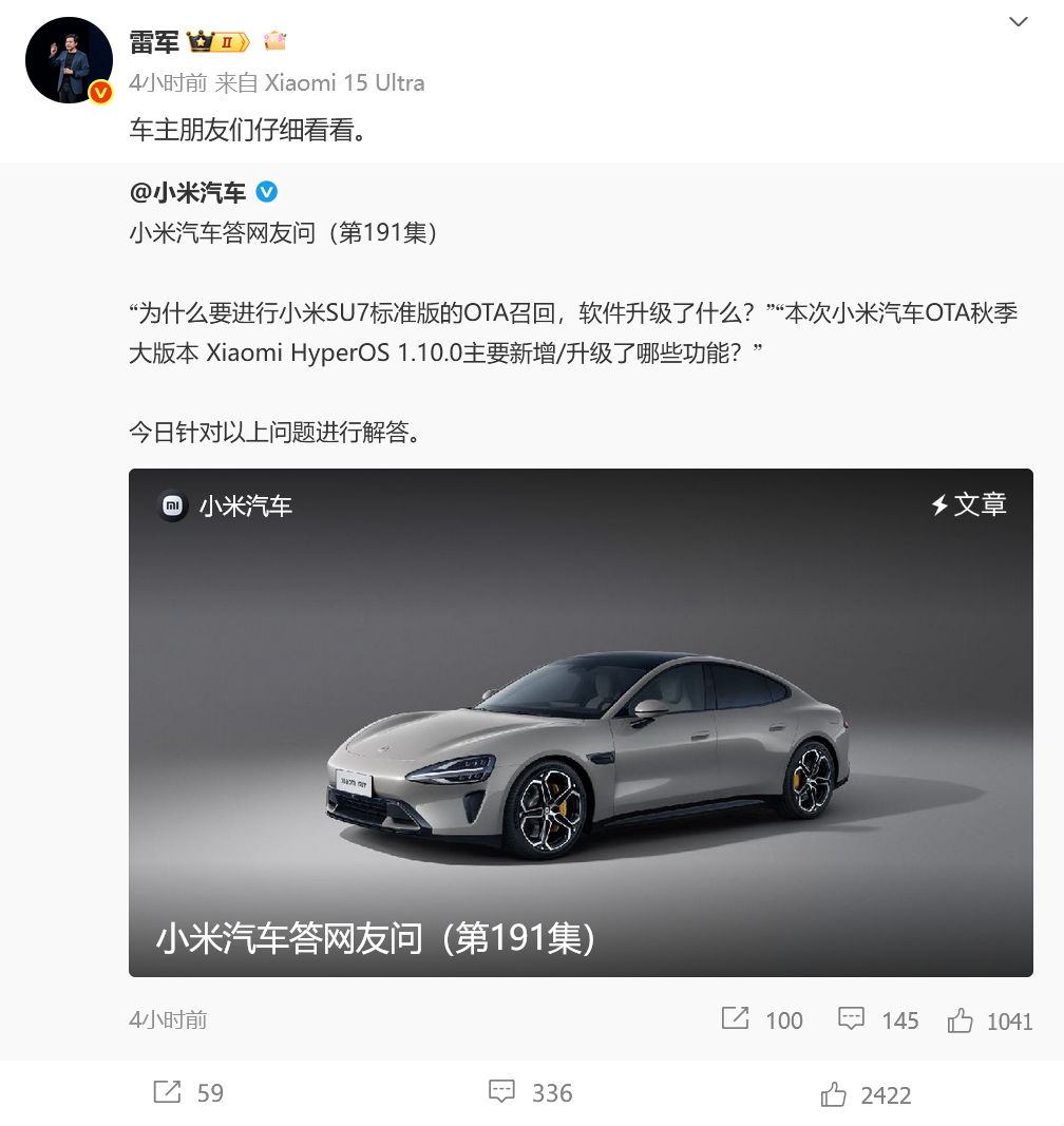 相關消息引發廣泛關注後,小米汽車官方在社交媒體發佈了《小米汽車答網友問(第191集)》,回應召回一事。 隨後,小米創辦人,董事長兼CEO雷軍轉發了相關內容並表示:“車主朋友們仔細看看”。