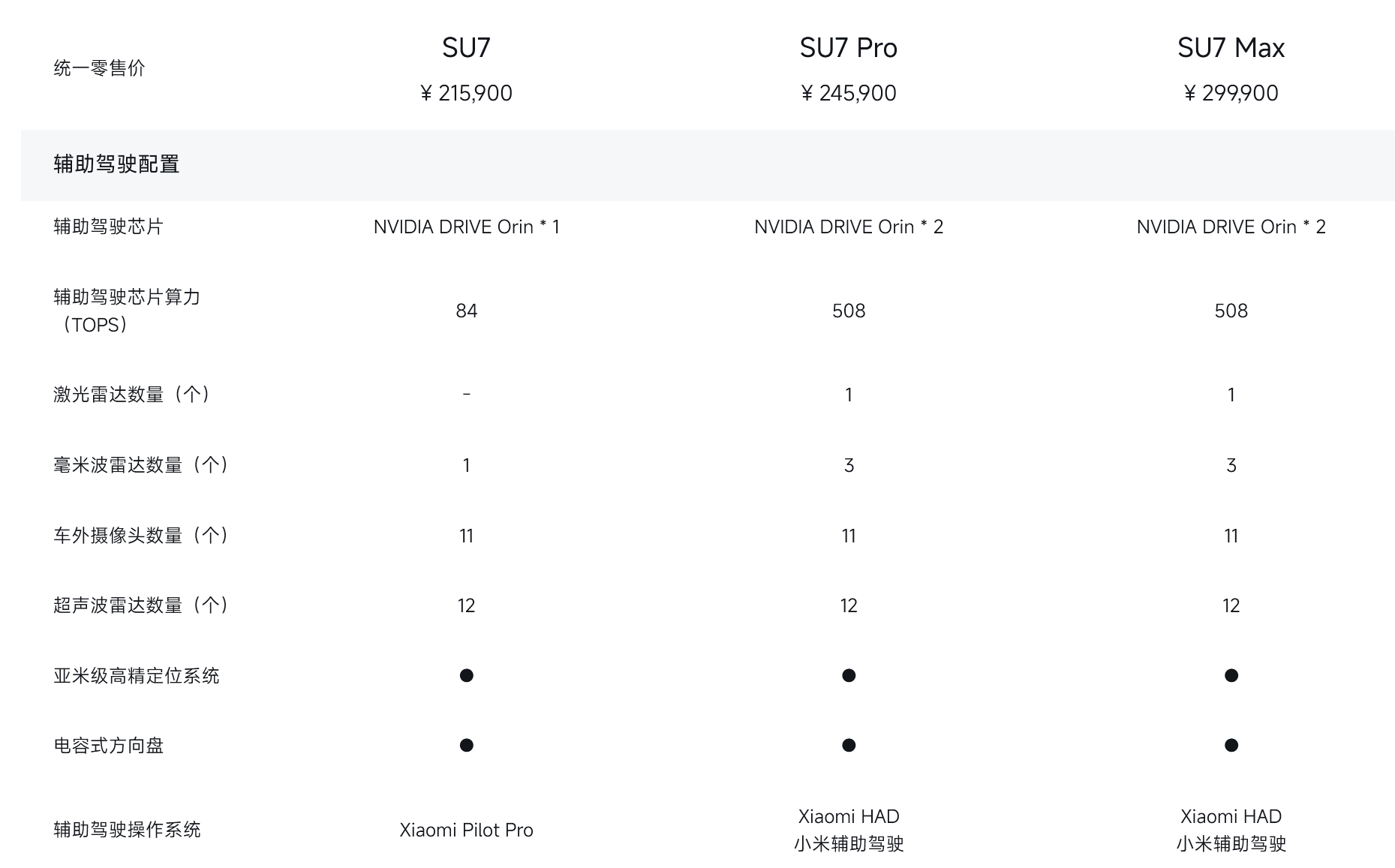 具體來看,小米SU7標準版採用純視覺智駕系統,配備一顆英偉達Drive Orin-N芯片,輔助駕駛芯片算力為84TOPS和一個毫米波雷達;小米SU7PRO及MAX版本配備激光雷達和雙Orin芯片,輔助駕駛芯片算力為508TOPS。從功能來看,小米SU7標準版僅支持高速公路領航輔助、代客泊車等功能;PRO及MAX版本配備端到端輔助駕駛系統,支持高速公路領航輔助和城市領航輔助,適用更多場景。