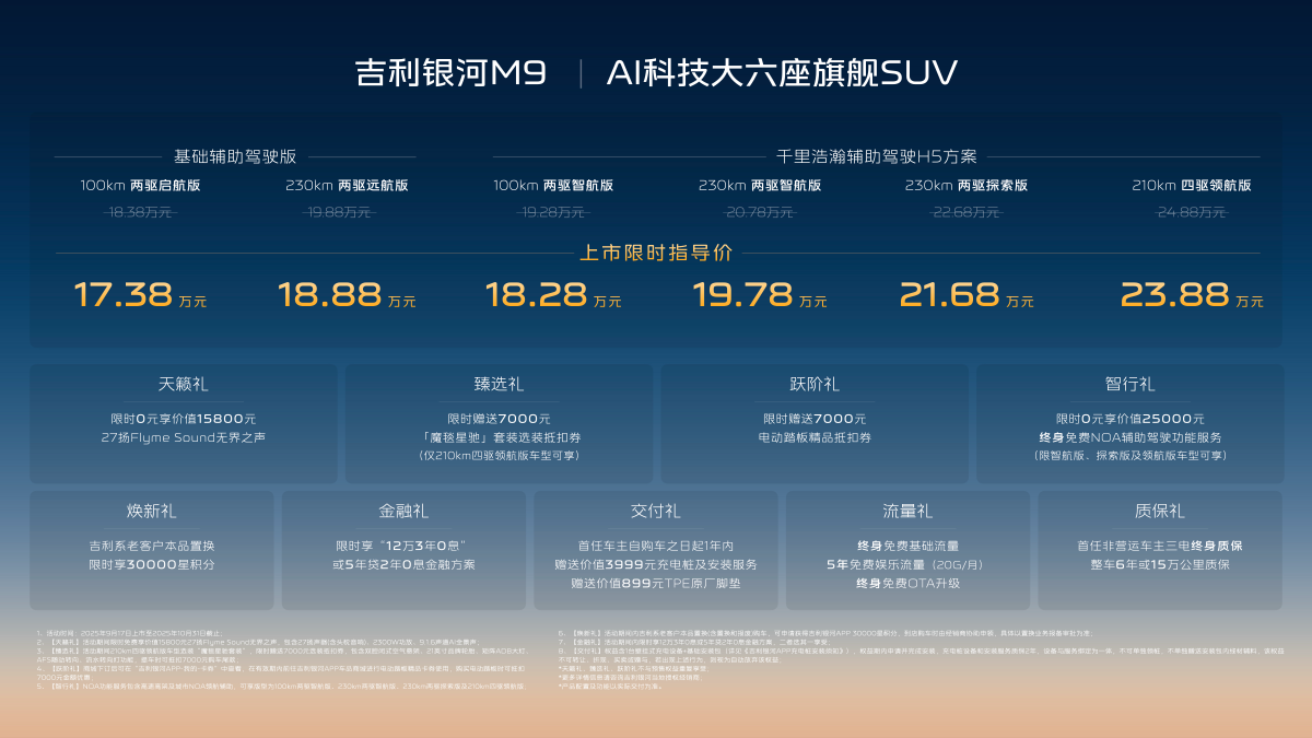 9月17日,吉利銀河M9正式上市,新車售價區間18.38萬—23.88萬元,疊加萬元置換補貼,其起售價下探至17.38萬元。