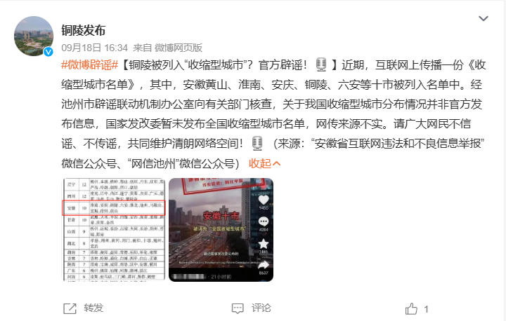 此外,包括“銅陵發佈”、“淮北傳媒發佈”、“網信黃山”等多個平台的地方政府官方賬號也都轉發或單獨發佈闢謠消息,表示關於我國收縮型城市分佈情況並非官方發佈信息,國家發改委暫未發佈全國收縮型城市名單,網傳來源不實。