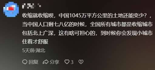 在相關話題的討論中,有部分網友對此不以為然,認為這是中國經濟和地方發展過程中所必然會出現的情況。還有網友表示中國其實早就有部分偏遠的縣鎮因“收縮”而破敗了,“收縮”的問題並不新奇。但更多網友,尤其是工作、生活在這些“收縮型城市”的網友則表現出對未來的不安,擔心未來生活條件會受到實打實的影響。
