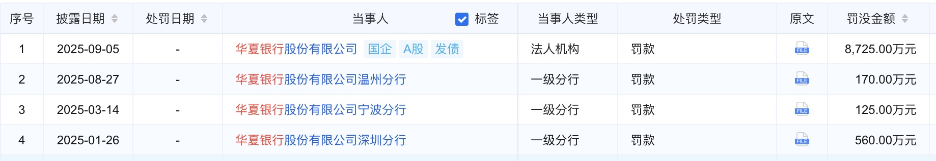 從全年監管處罰情況來看,華夏銀行的風險管控壓力更為明顯。截至9月5日,華夏銀行總行及至少17家分支機構2025年已累計被罰超1.02億元,超35名責任人員因履職不當被追責,超過百萬的罰單就共計四筆。這些處罰暴露出華夏銀行在風險管理體系方面存在的深層次問題。