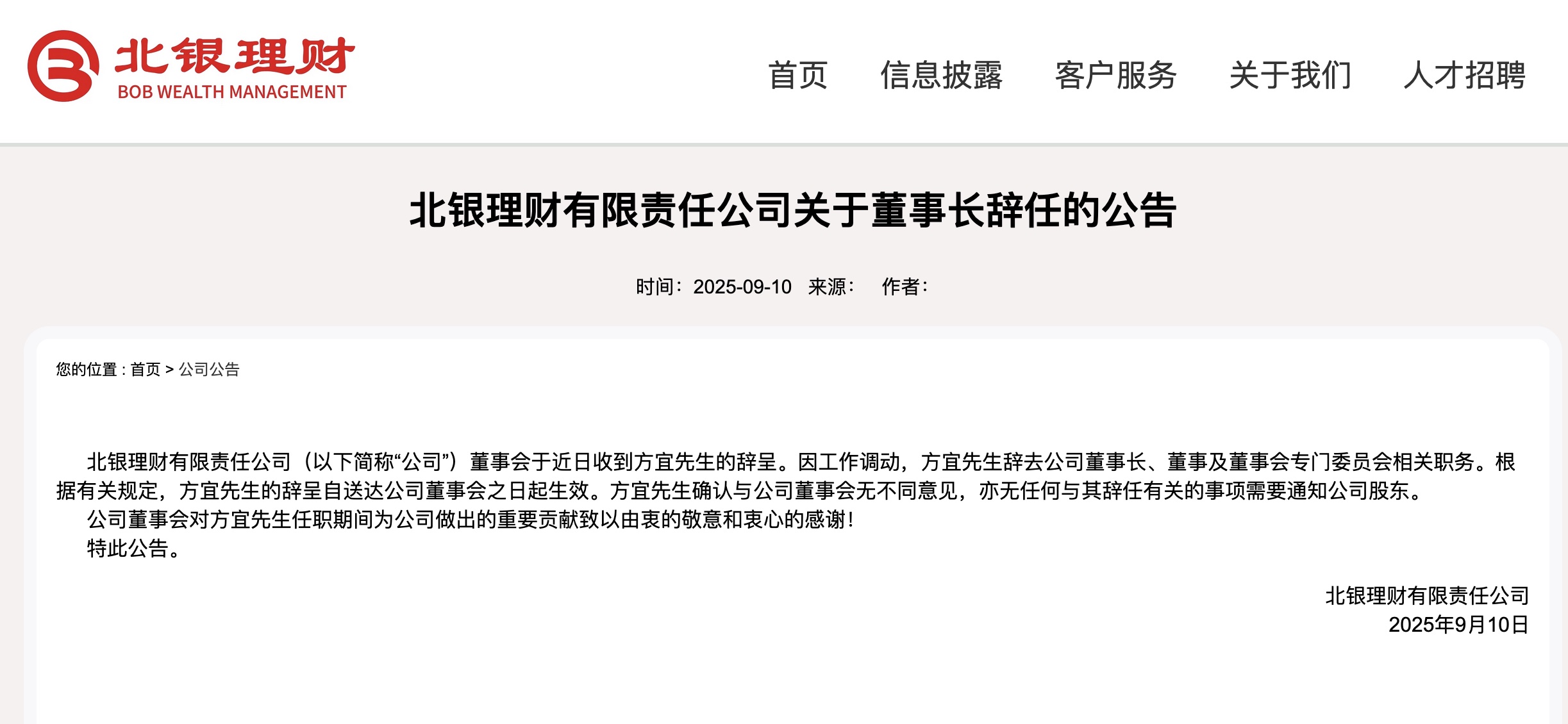 近日,北銀理財有限責任公司發佈公告稱,公司董事長方宜因工作調動原因正式辭去董事長、董事及董事會專門委員會相關職務。截至9月10日公告離職,方宜擔任北銀理財董事長的時間不足三個月,這已經是該公司年內第二任董事長辭任。