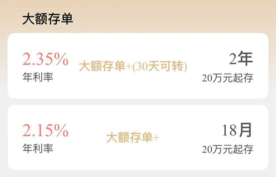 此外,蘇商銀行網站則顯示,其推出的2年期和3年期大額存單起存金額均為20萬元,年化利率分別達到2.1%和2.3%。