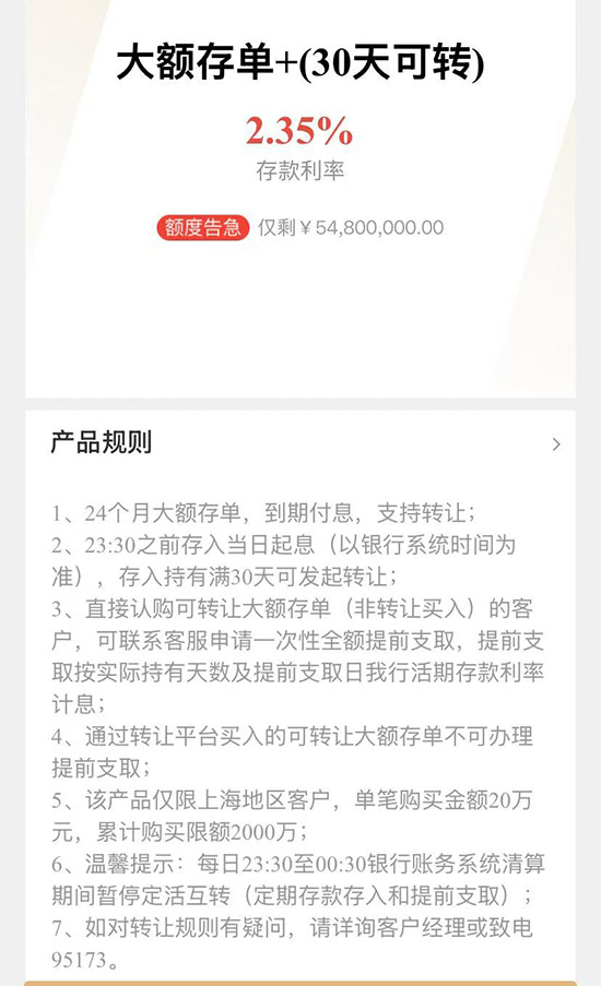 但兩款產品均註明“僅限上海地區購買”,且額度緊俏。截至目前,18個月期大額存單已“售罄”,2年期存單剩餘額度僅5480萬元。
