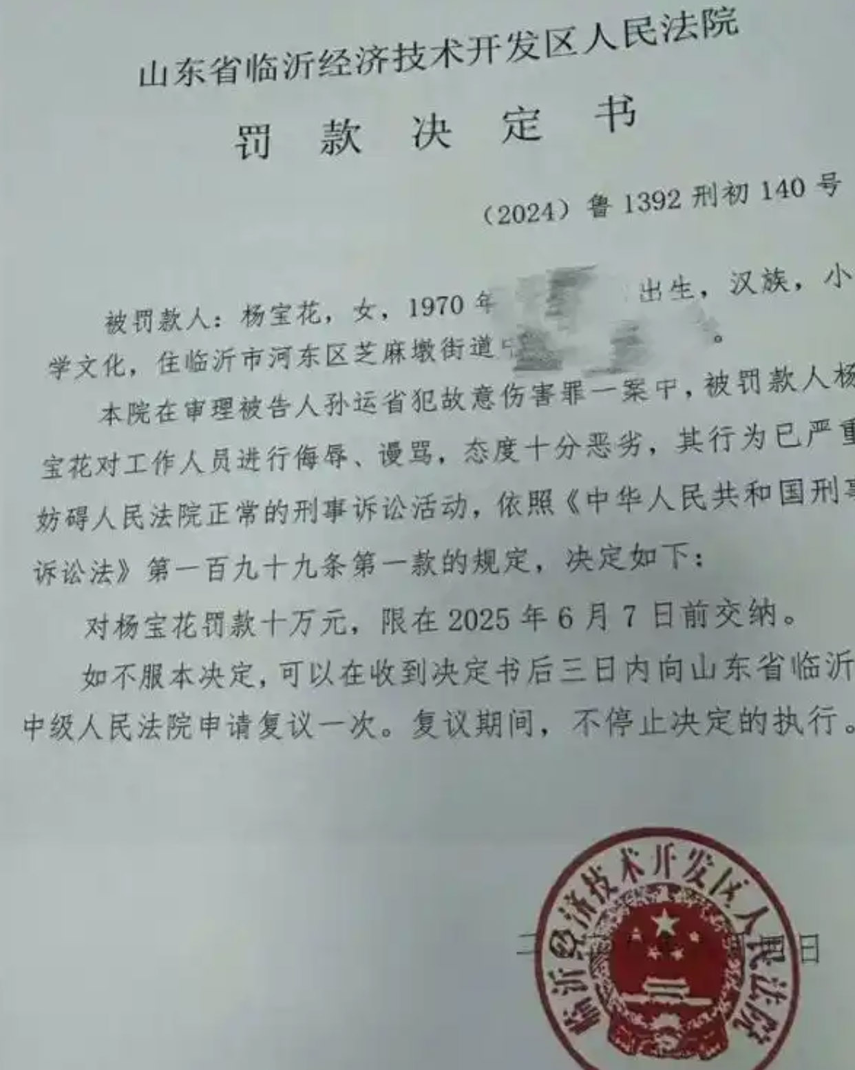 據中國新聞週刊此前報道,2025年6月,山東省臨沂市55歲農婦楊寶花,收到一份刑事附帶民事判決書(楊寶花的丈夫為原告)後,不服判決,來到臨沂經濟開發區人民法院執行大廳找到法官理論,其間與法官發生言語衝突。當天,楊寶花收到了10萬元法院罰單,同時被拘留15日。