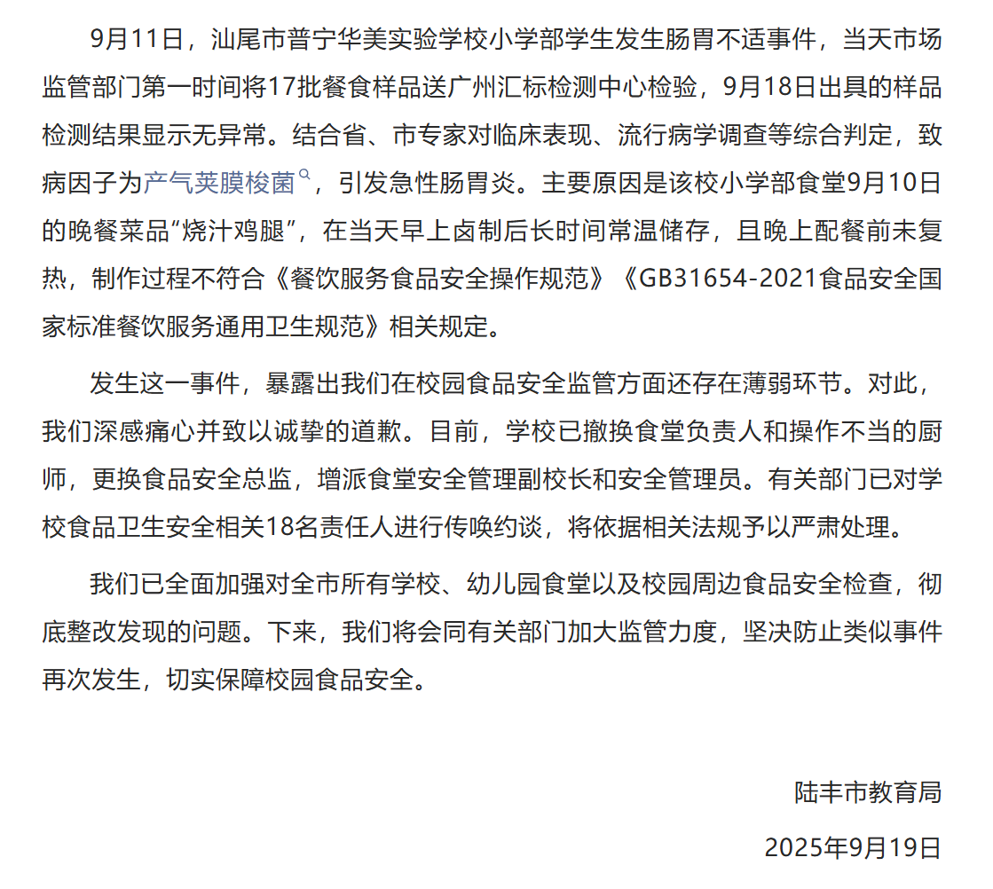 9月11日,汕尾市普寧華美實驗學校小學部學生髮生腸胃不適事件,當天市場監管部門第一時間將17批餐食樣品送廣州匯標檢測中心檢驗,9月18日出具的樣品檢測結果顯示無異常。結合省、市專家對臨牀表現、流行病學調查等綜合判定,致病因子為產氣莢膜梭菌,引發急性腸胃炎。主要原因是該校小學部食堂9月10日的晚餐菜品“燒汁雞腿”,在當天早上滷製後長時間常温儲存,且晚上配餐前未復熱,製作過程不符合《餐飲服務食品安全操作規範》《GB31654-2021食品安全國家標準餐飲服務通用衞生規範》相關規定。