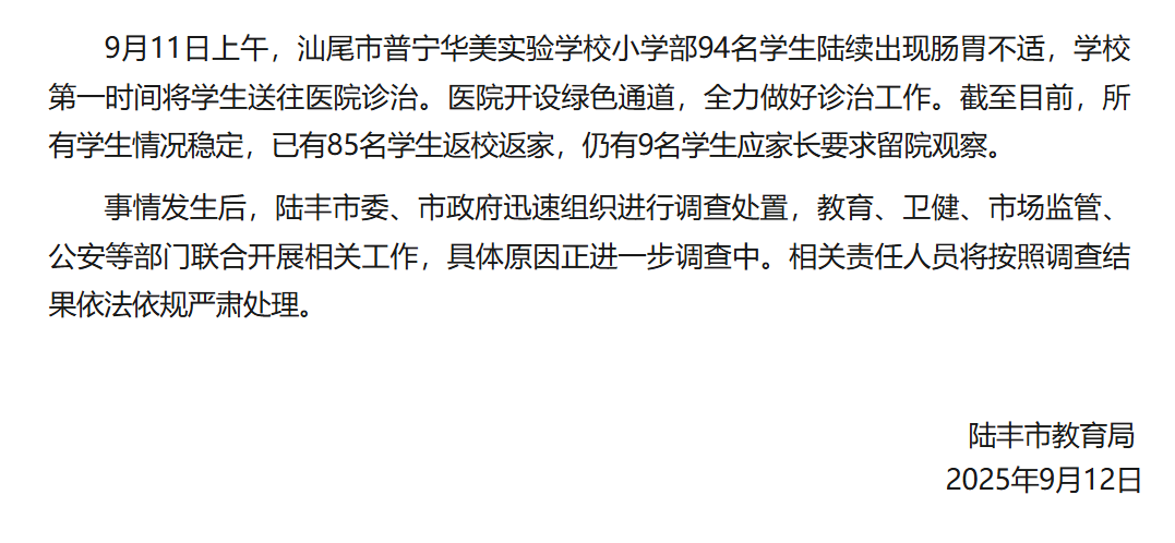 此前在9月12日,陸豐市教育局通報稱,9月11日上午,汕尾市普寧華美實驗學校小學部94名學生陸續出現腸胃不適,學校第一時間將學生送往醫院診治。醫院開設綠色通道,全力做好診治工作。截至目前,所有學生情況穩定,已有85名學生返校返家,仍有9名學生應家長要求留院觀察。