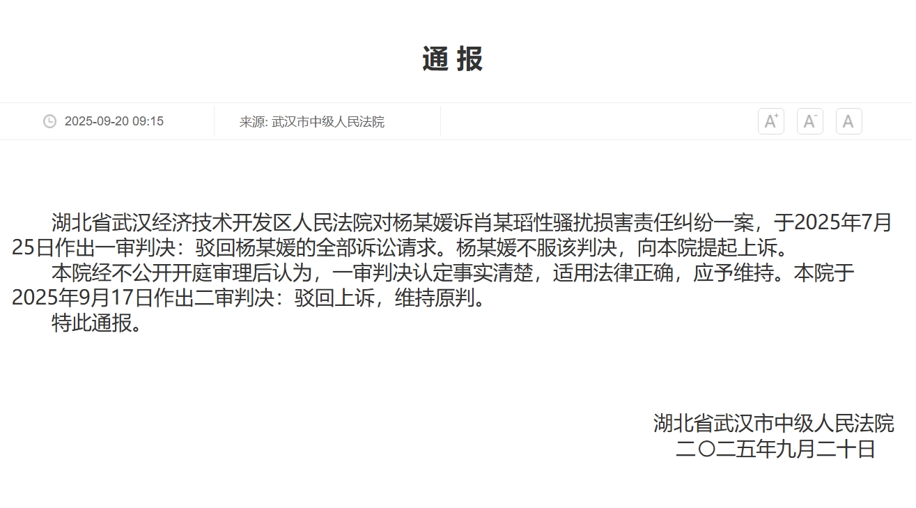湖北省武漢經濟技術開發區人民法院對楊某媛訴肖某瑫性騷擾損害責任糾紛一案,於2025年7月25日作出一審判決:駁回楊某媛的全部訴訟請求。楊某媛不服該判決,向本院提起上訴。