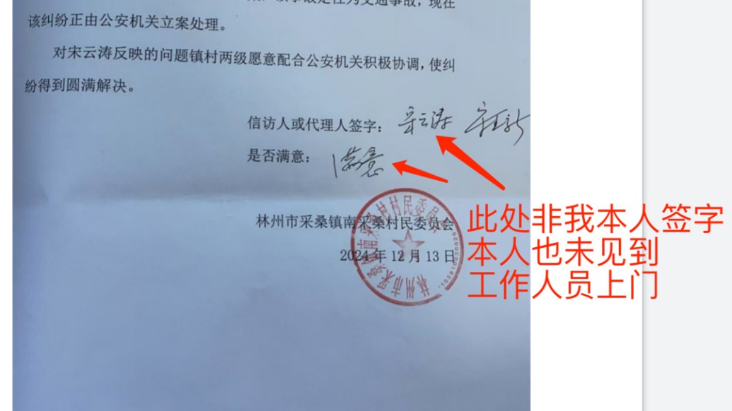 據澎湃新聞此前報道,宋某林兒子宋某濤舉報,河南林州市採桑鎮信訪辦事員偽造其簽名,向上回覆稱糾紛解決且當事人滿意,導致渠道被堵。南採桑村村支書表示,已向採桑鎮政府反映。