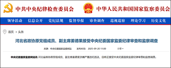 中央紀委國家監委網站9月20日消息,河北省政協原黨組成員、副主席姜德果涉嫌嚴重違紀違法,目前正接受中央紀委國家監委紀律審查和監察調查。