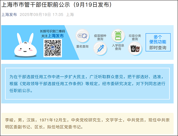 上海市市管幹部任職前公示,崇明區長李峻擬任地區黨委書記