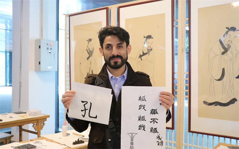 埃及青年漢學家穆成功(納吉赫·易卜拉欣)展示其書法作品。人民網